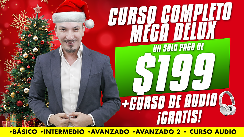 Paquete¡El curso Mega Delux lo tiene TODO! 🥇 Básico, Intermedio, Avanzado, Avanzado 2 y el curso en audio (¡valorado en $200!). 🔥 Aprende inglés en menos de 3 meses y transforma tu vida. ¡Es ahora o nunca! 🚀