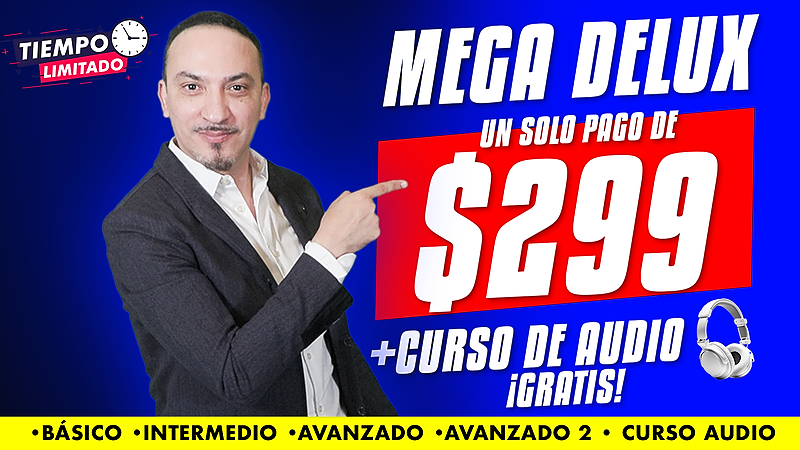 Paquete¡El curso Mega Delux lo tiene TODO! 🥇 Básico, Intermedio, Avanzado, Avanzado 2 y el curso en audio (¡valorado en $200!). 🔥 Aprende inglés en menos de 3 meses y transforma tu vida. ¡Es ahora o nunca! 🚀